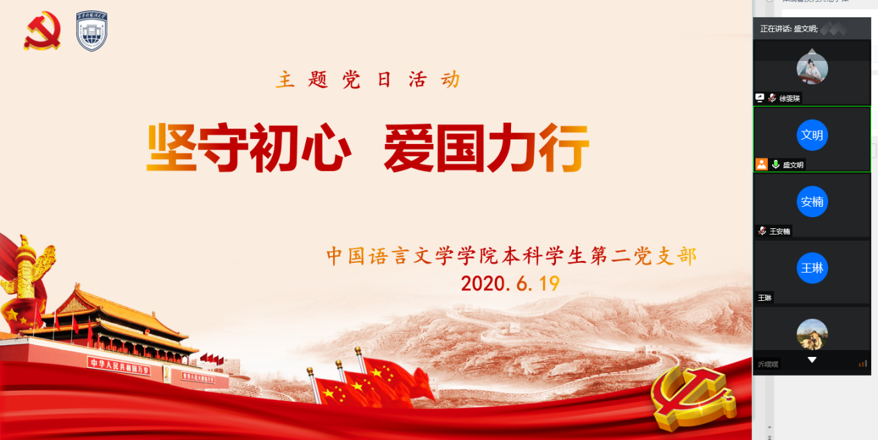 为热烈庆祝中国共产党成立99周年,认真贯彻落实习近平新时代中国特色社会主义思想,把学习贯彻全国“两会精神”和深入学习贯彻习近平总书记来陕考察重要讲话精神结合起来,推动“不忘初心、牢记使命”主题教育常态化长效化制度化,6月19日,九州娱乐城 本科学生党支部组织开展了“坚守初心,爱国力行”主题党日活动。本次活动由本科学生第二党支部书记徐雯瑛老师主持,本科学生第二党支部所有党员参加,本科学生第一党支部全体党员观摩学习。