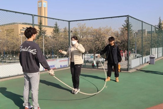 即跳长绳,两位体育部工作人员负责摇绳。老师可选择单独跳绳,也可选择多人跳绳,亦可进行八字跳绳。