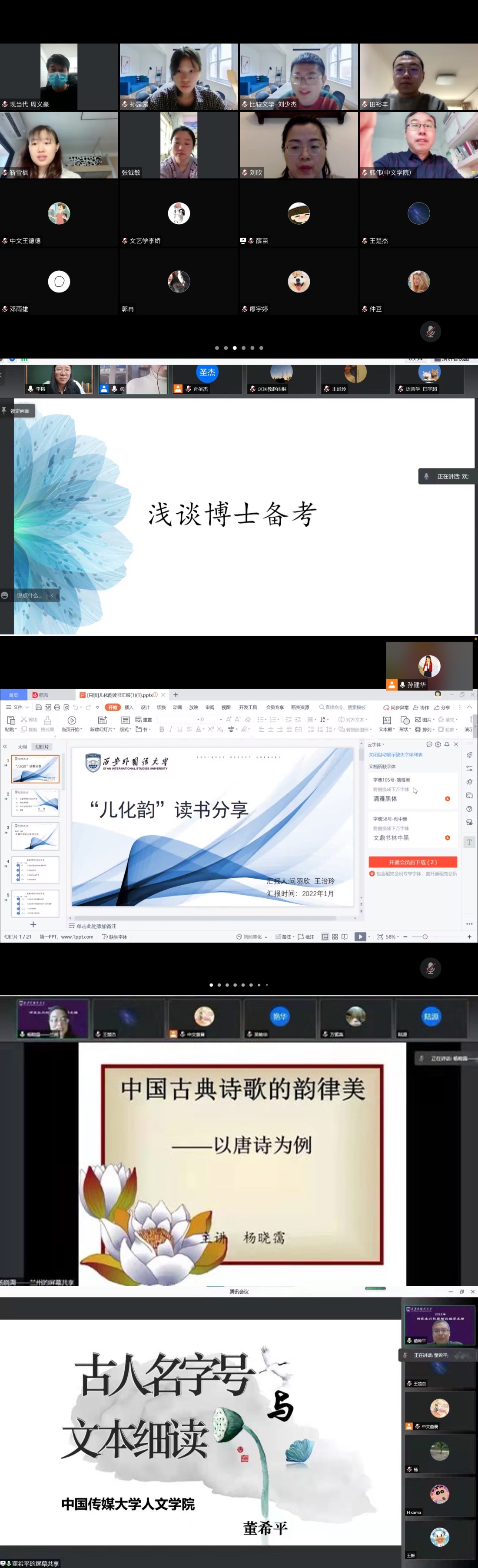 副院长董佳的《讨论“语言的意义”》、徐馥琼教授的《材料搜集、整理与论文写作——以<粤东闽语声调的格局和演变趋势分析》、孙建华副教授的《语言接触和语音变化》等;研究生读书会2场,主题分别为《生态文学与生态批评》和《事件哲学》。学术讲座从诗意栖居,与美偕行,到细读古人字号,体悟名家之风,以文学智慧洞察存在哲学,畅游语言世界,于学术交流中成长成才。本次共抗疫情云端学术周系列活动,研讨涉及面范围广、专业性强、主题多样、内容丰富,观察维度和开展方式新颖多样,学生踊跃参与,受到了各个专业学生的欢迎,为同学们带来了一场新奇充实的学术盛宴。