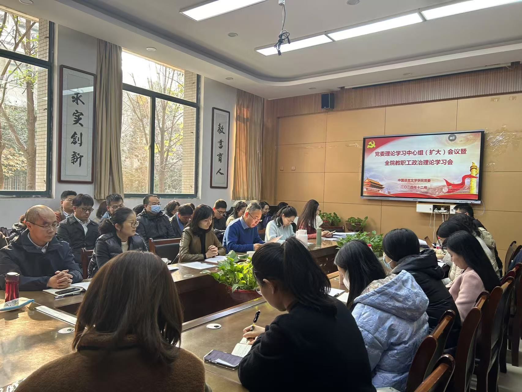 党委在JE126会议室召开党委理论学习中心组(扩大)会暨全体教职工政治理论学习会议,学院党委理论学习中心组成员、全体教职工参加会议。