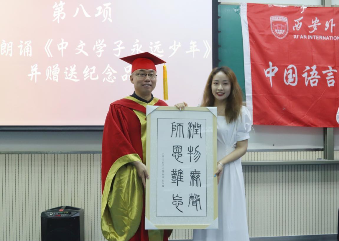 随后,院长韩伟为研究生及本科毕业生代表依次拨穗正冠,颁发学位证书并合影留念。一声声饱含深情的寄语,一张张笑意盈盈的合影,寄托着学院对即将踏上美好征程的毕业生的殷切期望与美好祝福。接着,毕业生代表为学院献礼,院长韩伟代表学院接收毕业生的纪念礼物,一幅由学生亲笔书写的“润物无声,师恩难忘”的字画,表达了毕业生对学院的感激和不舍之情。