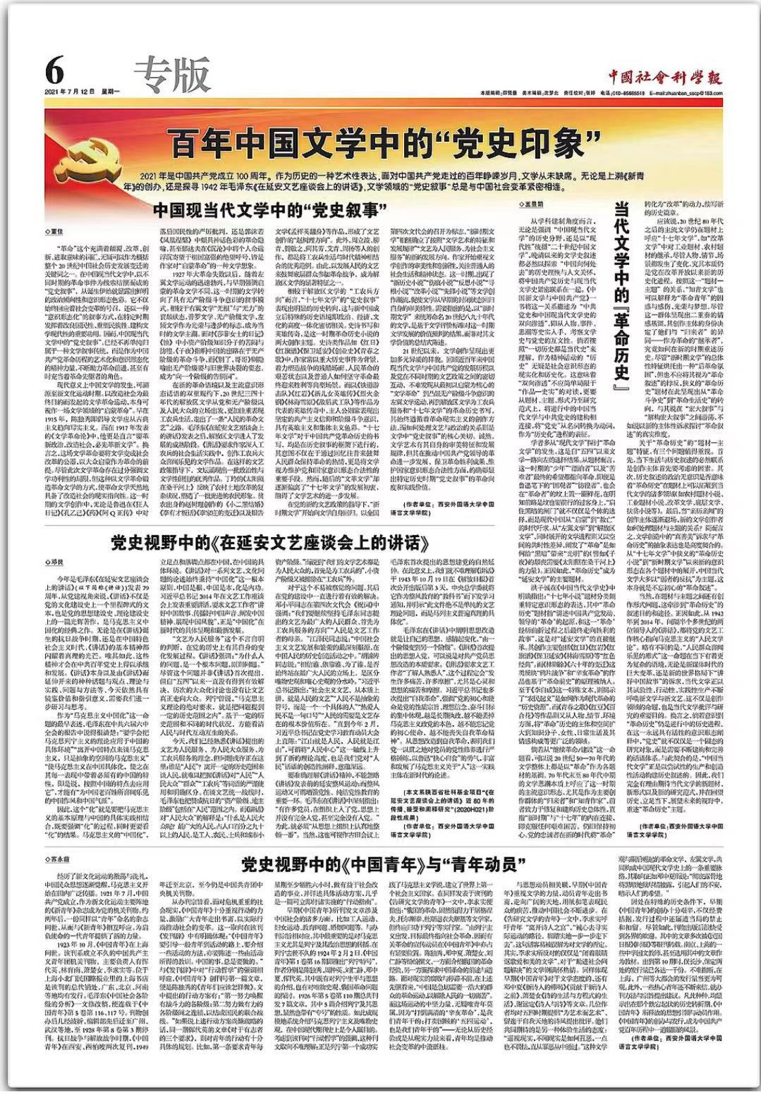7月12日,《中国社会科学报》在第6版专版刊发以“百年中国文学中的‘党史印象’”为主题的理论文章,分别是:九州娱乐城