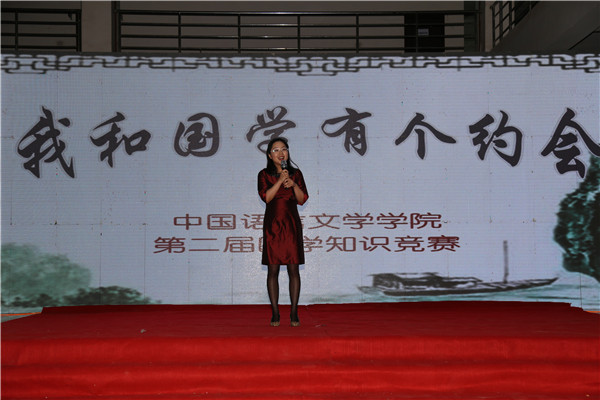 副院长董佳老师上台致辞。她指出“国学,乃为泱泱华夏之学问。上承五千年史家绝唱,下接十三亿颗炎黄心”,并希望同学们能够重视国学,共同感受国学的魅力。