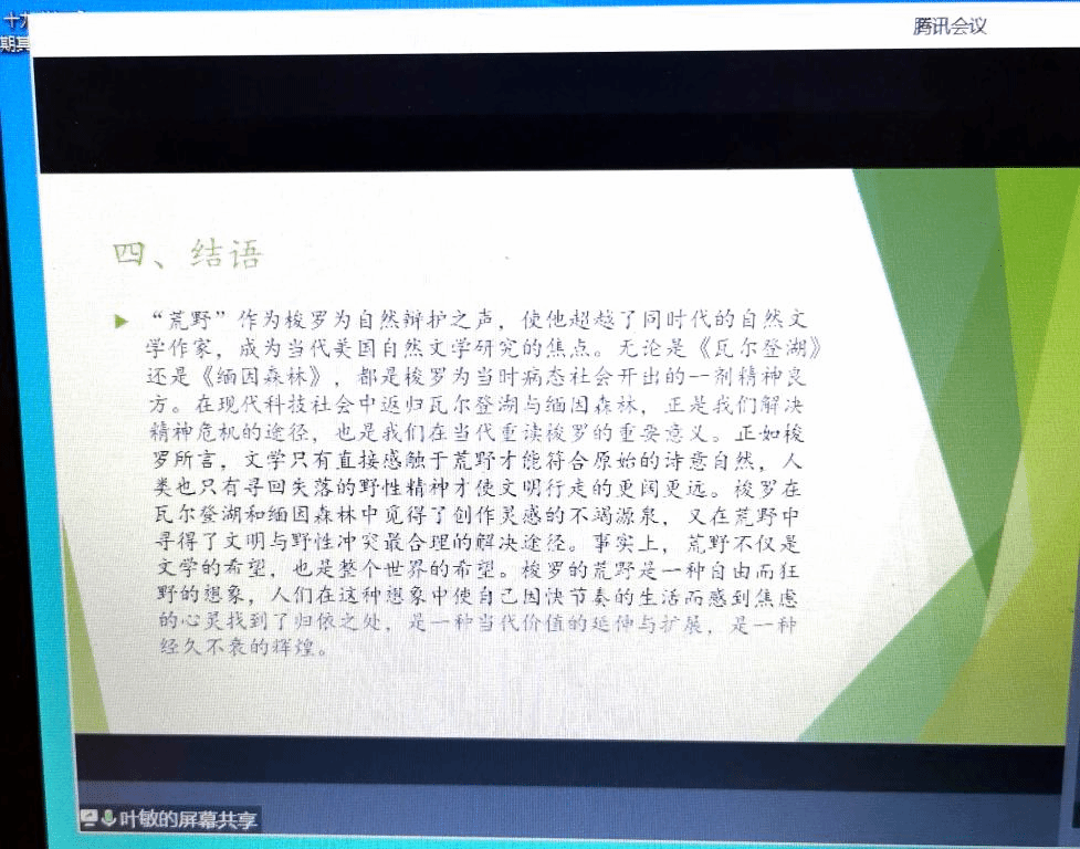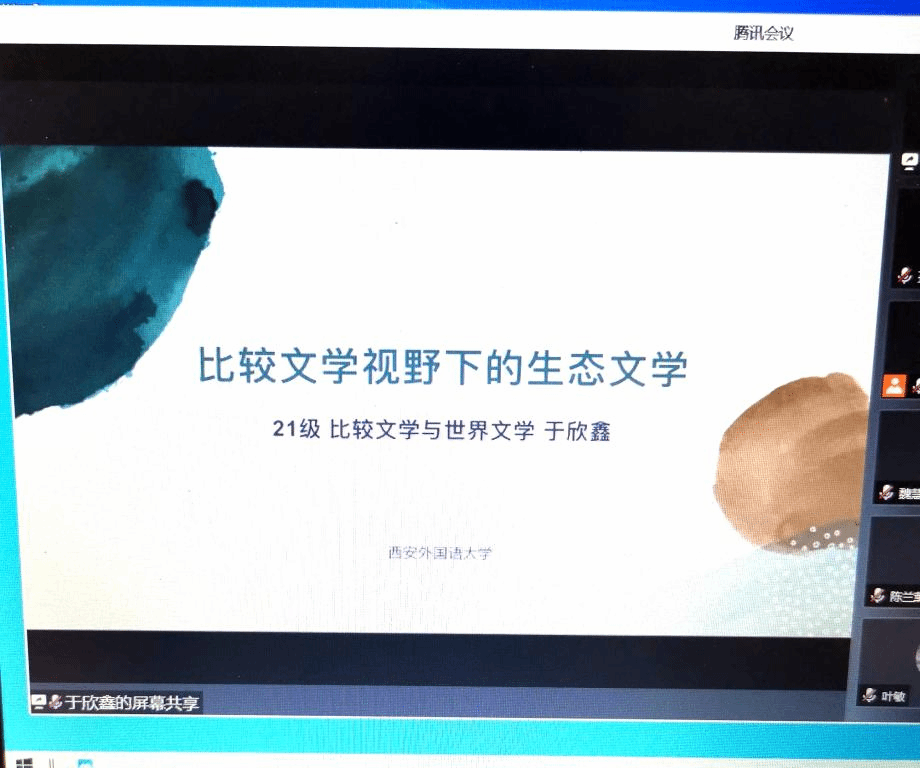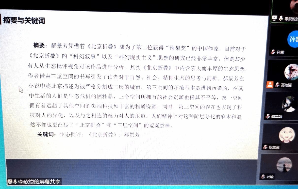 比较文学与世界文学专业研究生李欣悦《生态批评视域下<北京折叠>中的三重空间》认为,《北京折叠》内含宏大而丰厚的生态思想,作者郝景芳借由三重空间的书写,向读者展示了她基于自然、社会、精神等三重维度的生态思考与剖析。比较文学与世界文学专业研究生于欣鑫《论比较文学视野下的生态文学》在比较文学视野下以东西方生态文学的源起为始,以生态文学作品为例,寻求生态文学发展的根基与存在的必然性,探讨东西方生态文学的连接与共融点,促使生态的文化空间可持续发展。苏永前老师从比较文学的宏观视野,讨论了生态文学中西比较的可能性,肯定了两位同学论文写作的视角,同时指出论文题目过于宏大等问题。