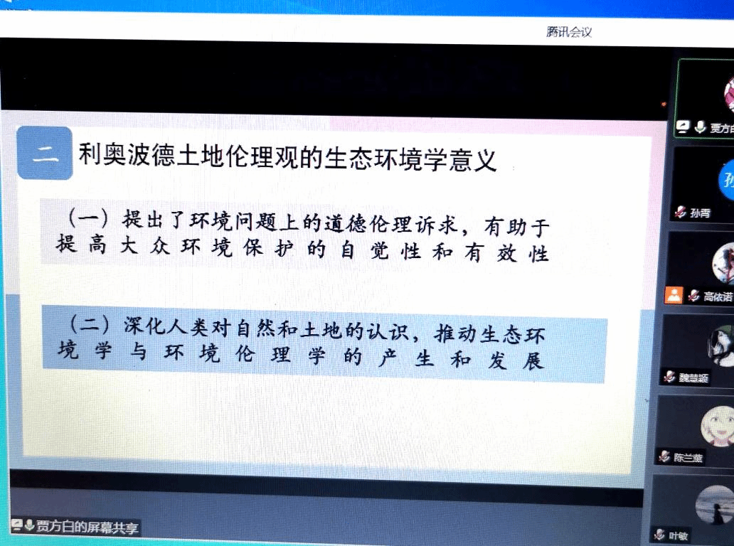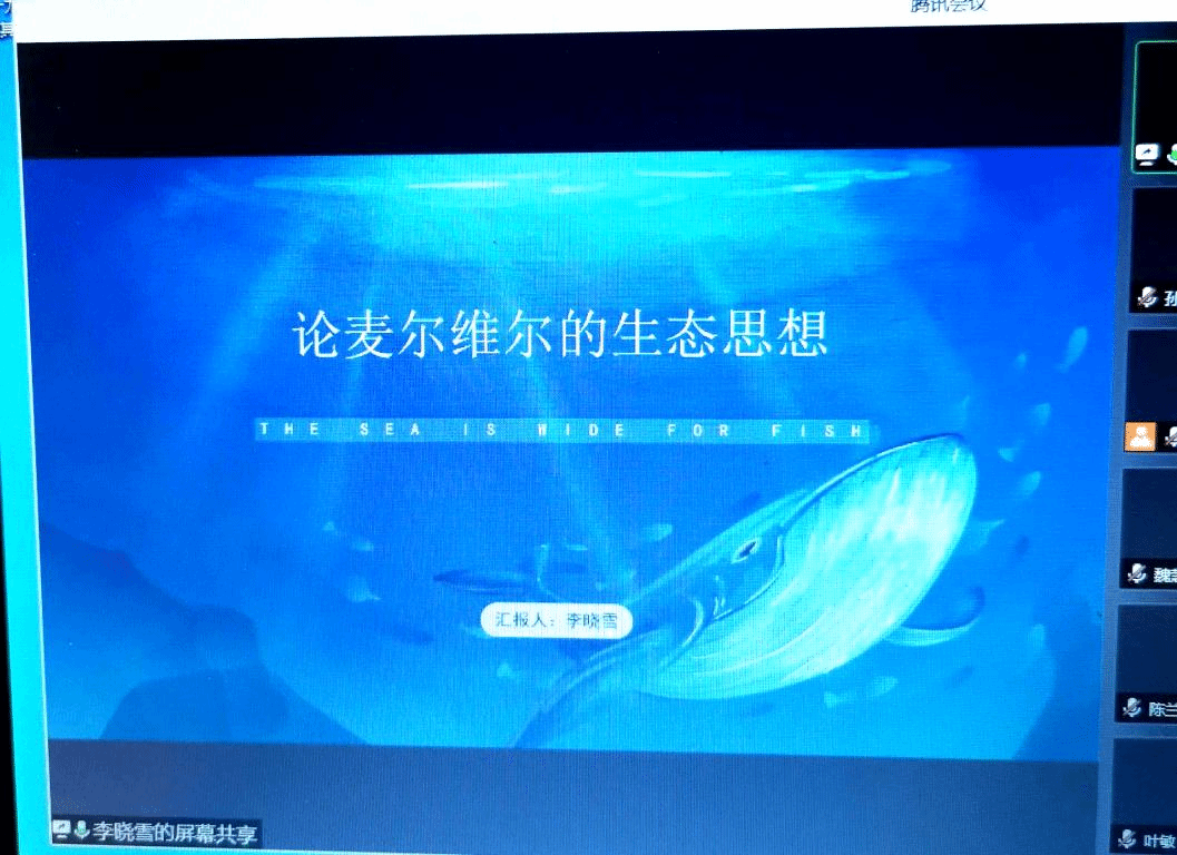 比较文学与世界文学专业研究生贾方白在以《<沙乡年鉴>中的“大地伦理”观及其所面临的困境》为题的分享中,以利奥波德的“大地伦理”和“生态中心主义”为基本原则,认为生态伦理学困境的突破,正在于从“大地伦理”必须走向“大地美德”的可能性。比较文学与世界文学专业研究生李晓雪以《论麦尔维尔的生态思想》为题深入分了麦尔维尔海洋文学作品中的生态意识,探索麦氏文学创作生态思想的追寻,勾勒出作家建设人类诗意家园的生态情怀,为解读麦尔维尔作品提供生态维度视角。孙旭老师肯定了两位同学的选题和表达,并在点评时提出,生态文学的研究仍需落在哲学维度,建议同学们参考海德格尔哲学,从存在论的角度落实生态文学研究。