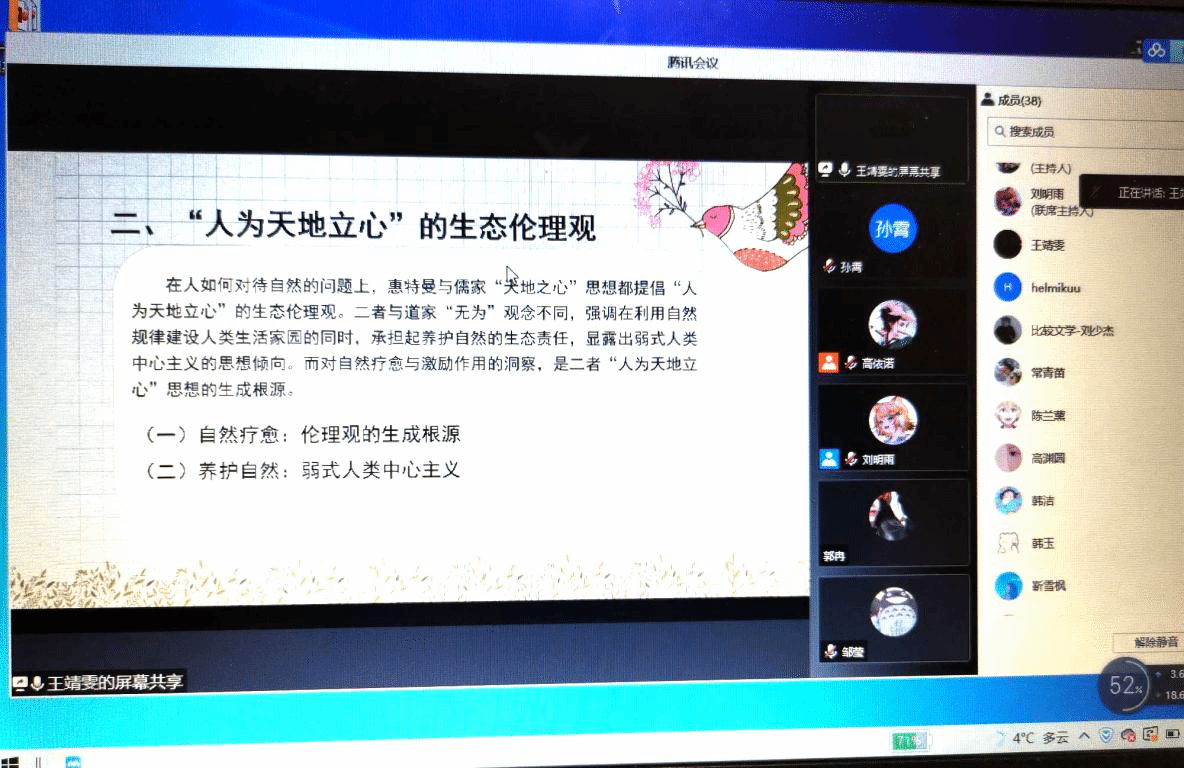 比较文学与世界文学专业研究生王靖雯《儒家“天地之心”与惠特曼的生态智慧》通过细究惠特曼的诗歌创作及理论建构,可发现他对人与自然关系这一生态研究的中心问题的思考,与中国儒家学派中的“天地之心”观念具有广阔的契合之处。比较文学与世界文学专业研究生郑雅芳《栖居之“尺度”——陶渊明筑造的东方“澄明之境”》探讨了陶渊明于“此在”中所筑造的物化世界们,认为陶渊明笔下的“敝庐”“耕织”与其诗歌本身同海德格尔诗意栖居的内涵交相辉映。邹莹老师指出两位同学研究中的优点与不足,同时与两位同学进行了关于论文内容的讨论。