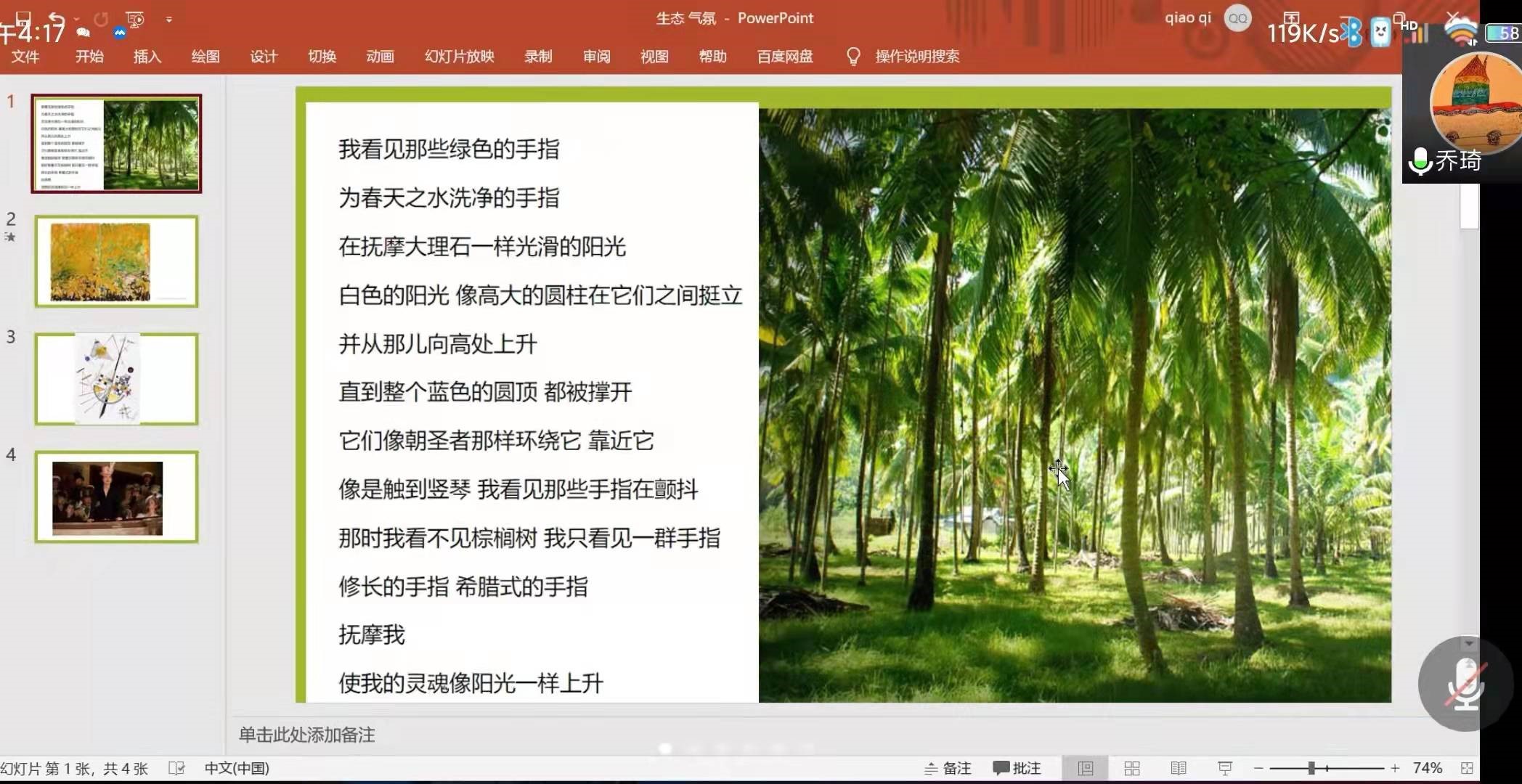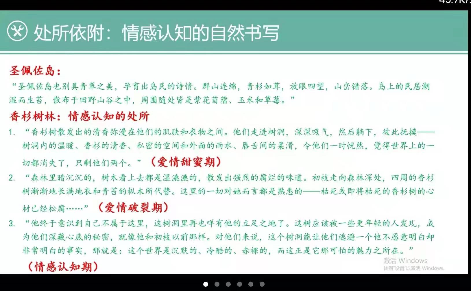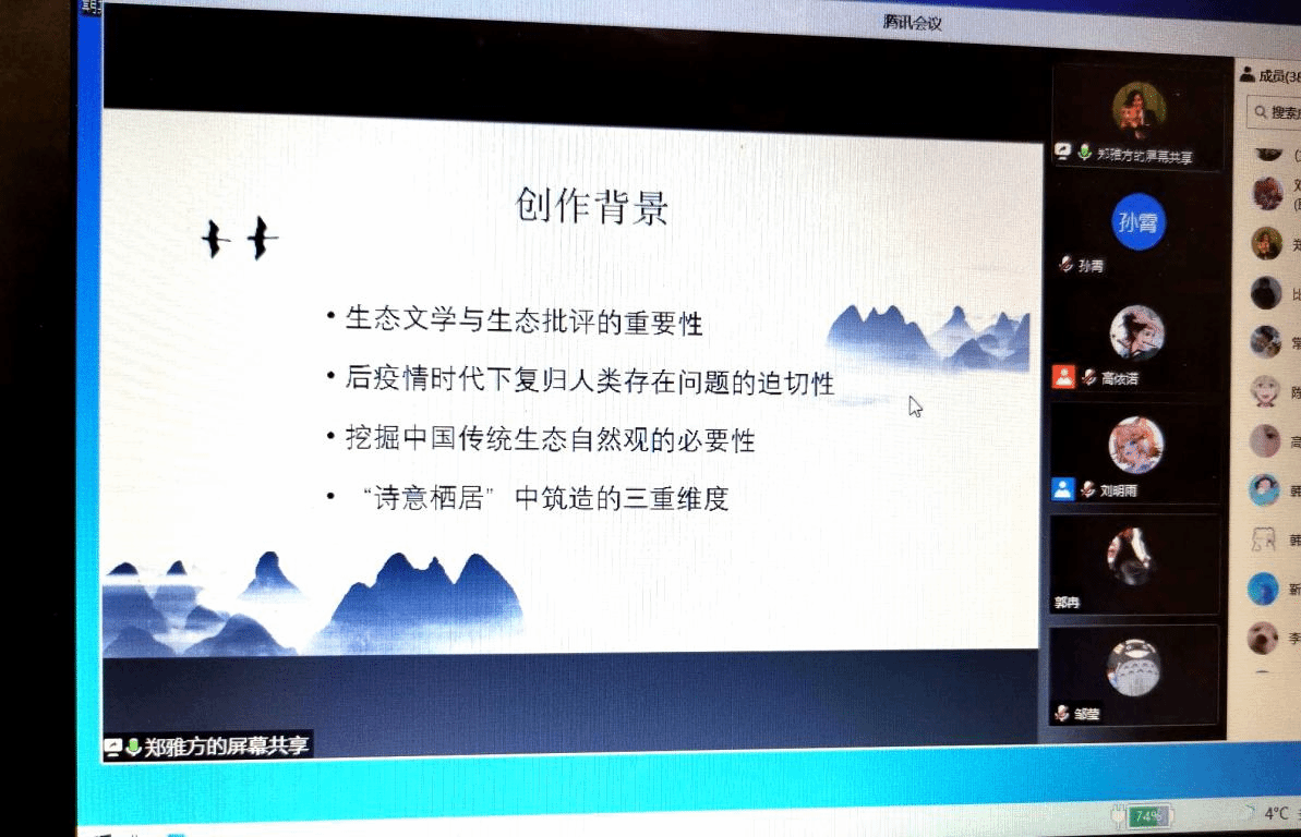 中国现当代文学专业研究生摆璐璐《生态自然美学:气氛美学的物及其迷狂》基于德国哲学家格诺特·波默关于气氛美学的理论展开论述,探讨气氛作为生态美学核心概念等价值和意义,分析感性经验和感性知觉作为生态自然美学主题的可能性。比较文学与世界文学专业研究生刘勇君《处所与认知:<雪落香杉树>的生态书写分析》从处所依附、处所标记和处所剥夺几个层面来分析《雪落香杉树》的生态书写特色,探究了特定自然区域对人的情感认知、生态身份认同及人性的发展问题。乔琦老师通过《阳光下的棕榈树》一诗,延续两位同学的发言内容,探讨了生态文学中的生态意识及其对我们的启示。