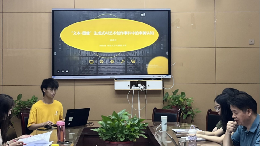 第一位发言的是2021级比较文学与世界文学专业硕士研究生刘勇君,论文题目为《“文本-图像”生成式AI艺术创作事件中的审美认知》。论文从AI艺术图像的创作图示、美学崇高性审视与审美空间三个层面来分析AI艺术创作事件中的审美认知问题。