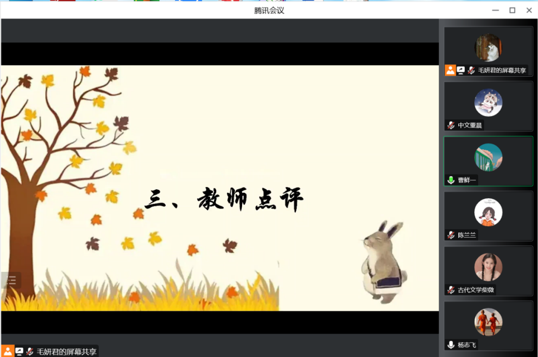 在教师点评环节中,毛妍君老师鼓励同学们要逐步实现由本科生到研究生的角色转变,在读书会上应该优先选择专业性的学术著作作为自己读书分享的相关书目,同时要求各位同学不要满足于单本学术专著的阅读,要学会“文献溯源”的本领,以一本书籍为出发点,追溯其原始文献来源和出处,探寻其原初意义和发展流变,实现阅读量的拓展。王萍老师着重强调了读书报告语言的专业性和严谨性,行文应该注重逻辑性,鼓励大家多向各位老师学习。杨志飞老师提示同学们应该关注和重视原始文献,在研究过程中切不可固步自封,要注意文学、史学、哲学之间的相互借鉴,学会“以小见大”,从“小细节”发现“大问题”。董晨老师肯定了各位同学积极努力的阅读态度,希望大家在今后的读书和求学之路上逐步明确问题意识,在语言表达的规范性、逻辑性、准确性上多下功夫,从前辈学者的论著或论文中汲取经验,逐步掌握一些学术研究的基本方法。
