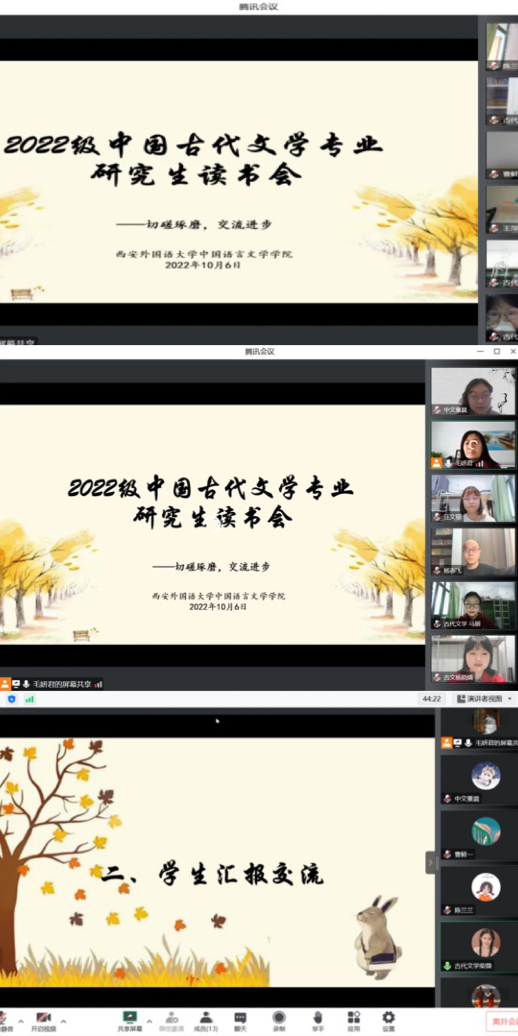 古代文学专业通过腾讯会议在线举办2022级研究生新生读书会。古代文学专业导师毛妍君、王萍、杨志飞、董晨以及2022级古代文学专业的九位研究生同学参加了此次读书会。会议由毛妍君老师主持,董晨老师致开场辞,曹鲜一、柴薇、陈兰兰、马丽 、罗婷、汪文丽、杨晓婧、张蓝丹、张明慧九位同学围绕“假期阅读感受最深刻的”这一主题进行了阅读分享。