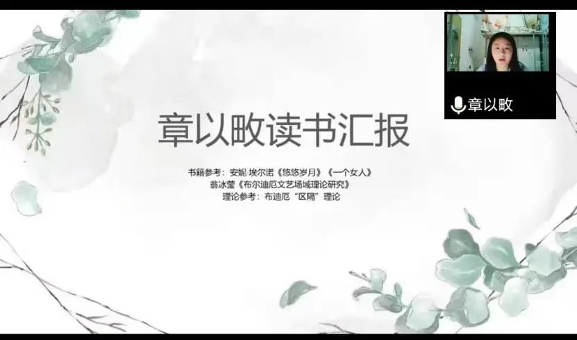 章以畋同学首先论述了安妮·埃尔诺的背景以及当前学术界对她的关注。同时分析了布迪厄的文艺场域理论,认为该学者犀利的揭示了资产阶级对于底层阶级的统治与区隔。最后将安妮·埃尔诺的作品与布迪厄所阐释的“社会区隔”概念相勾连,分析埃尔诺文学创作中体现出强烈的社会批判色彩。
