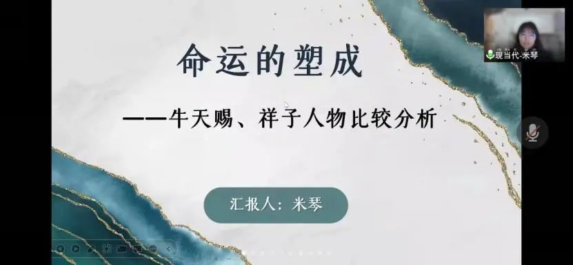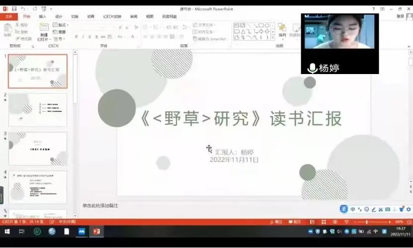 杨婷同学主要分享研读孙玉石教授所撰写的《<野草>研究》后收获的三点知识:一是《野草》的艺术探源;二是以《题辞》为例探究《野草》中鲁迅的精神世界;三是以《秋夜》为例分析鲁迅对于民族、国家和人性的哲学思考,体会鲁迅自我剖析和不懈斗争的精神。