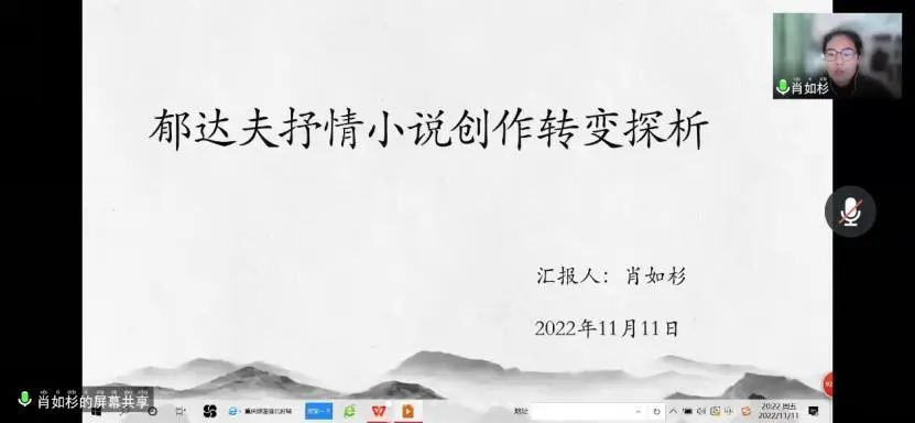 肖如杉同学认为,中国现代文学史上郁达夫的创作极具个人特色,具有浓郁的浪漫主义气息,初期小说创作更是引起巨大争议。郁达夫的文学创作也一直被贴上“颓废”“色情”“小资产阶级的自我感伤”等等标签。但是在创作社的转向中,郁达夫表现了极高的政治革命热情,后续创作中更是展现了一个柔软内心的抒情作家坚定的革命意志。肖如杉总结认为,这些创作中仍有局限之处,但不能否认郁达夫的方向转变以及由此而来为后来者提供的启示与反思。