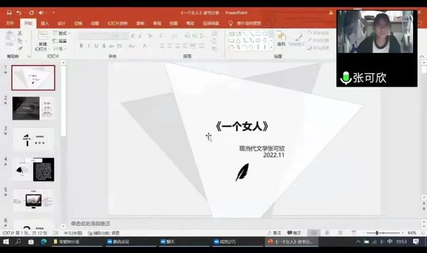 首先,庞袁君同学通过分析父权社会下的奴隶社会到提出“妇女解放”命题的五四时代的女性地位,从而揭示五四时期男权视域下压抑于历史地表的女性启蒙。接着通过列举丁玲受制于左翼的政治立场,以及冯沅君通过规避女性自我并从爱情作为切入口以获得进入时代历史的权力,来体现女性自我书写的艰辛。结语部分,她分享女权主义者们的观点,鼓励女性能够浮出历史地表,勇敢的站在时代的地平线上。