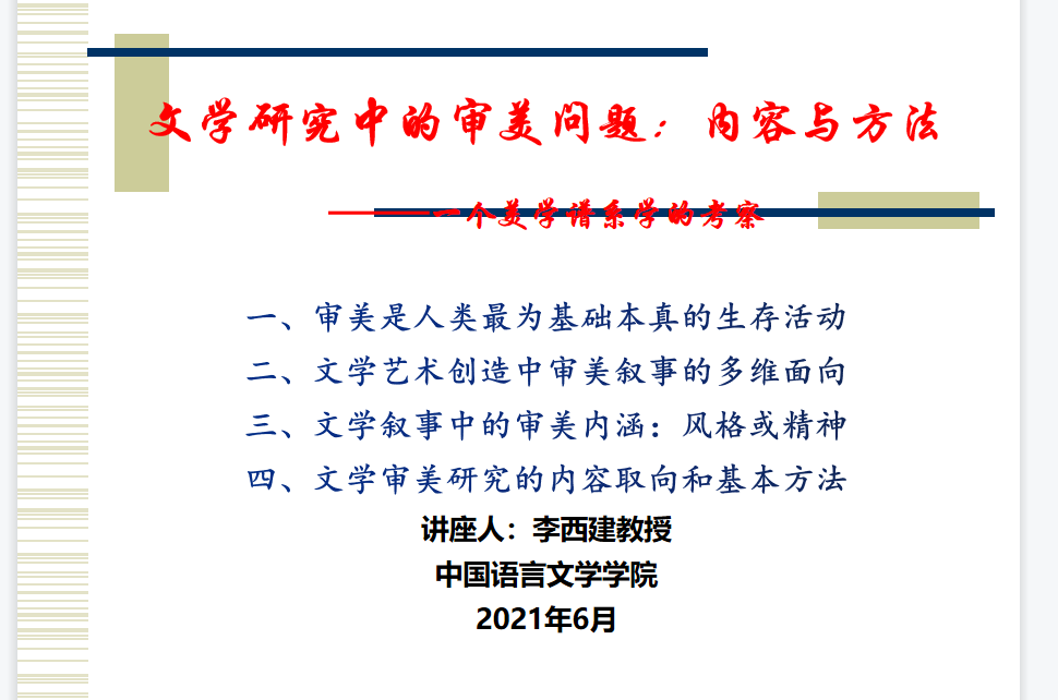 李老师对文学研究中的审美问题的解读主要从四个方面展开,第一是认为审美是人类最为基础本真的生存活动。第二是解读了文学艺术创造中审美叙事的多维面向。第三则从文学叙事中的审美内涵:风格或精神来阐释。第四讲了关于文学审美研究的内容取向和基本方法。