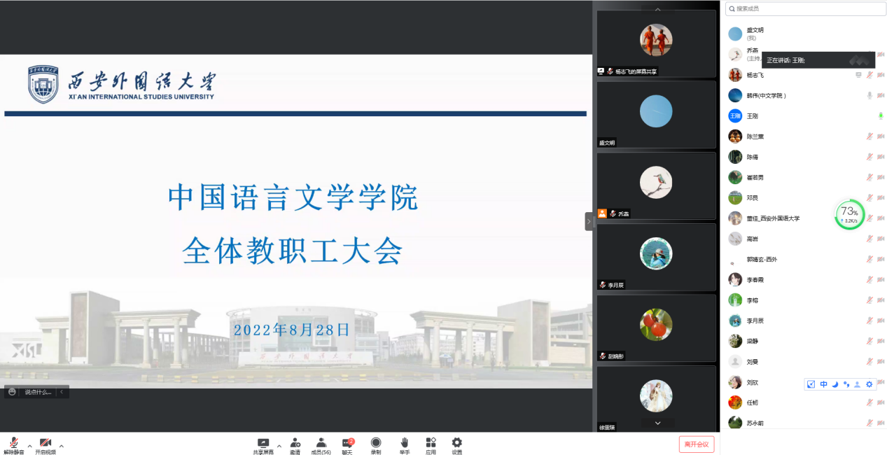 2022年8月28日上午,中国语语言文学学院召开线上全院教职工大会,学院党政领导及全体教职工参会。会议由学院党委书记王刚主持。