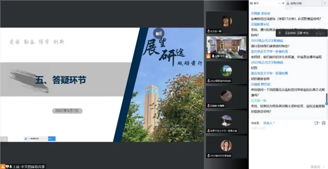 在最后的答疑环节,辅导员老师耐心聆听2022级新生问题,并从返校政策、校园生活、课表安排等方面给予细致解答。
