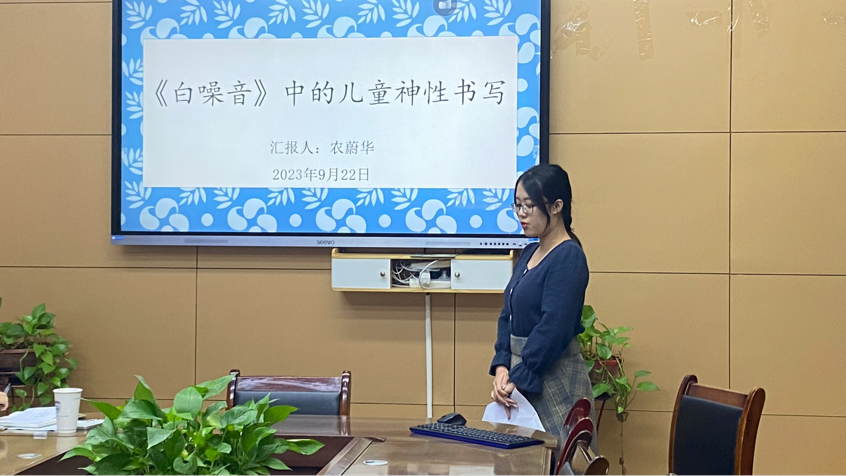 第5位发言人农蔚华的主题为《〈白噪音〉中的儿童神性书写》。复合死亡哲学、儿童观念等视域,以德里罗为何神化儿童、神化儿童的价值分析与神化儿童的现实要求为论述主线,探寻小说的独特艺术思维。