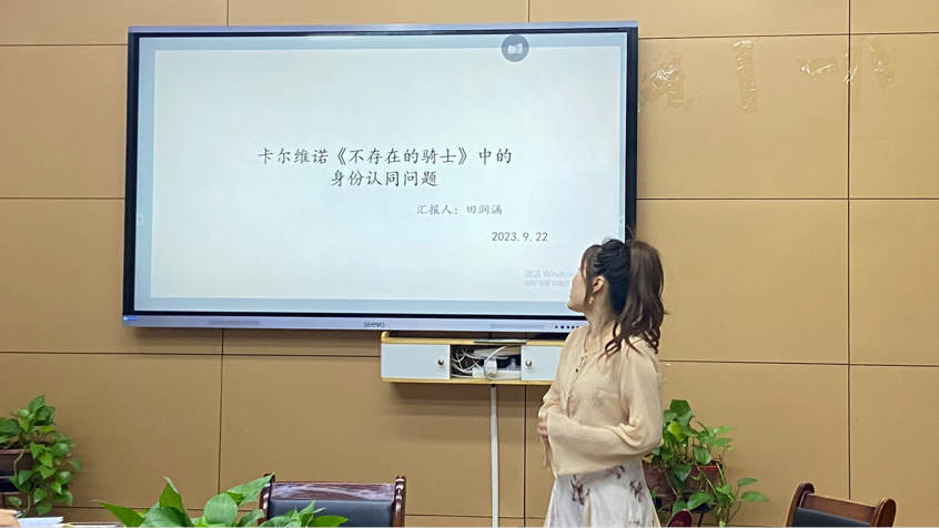 第3位发言人田润涵以《卡尔维诺〈不存在的骑士〉中的身份问题》为题,针对性讨论文本中三位骑士的身份问题,总结梳理为身份焦虑的产生、身份危机的浮现及身份建构的历程三个逻辑层次。论文同时借力拉康镜像理论,强调自我意志、行为和精神对于身份认同的重要作用。
